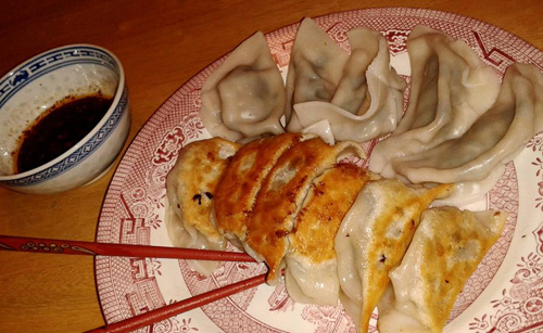 水餃子と焼き餃子。黒酢で食べます。
